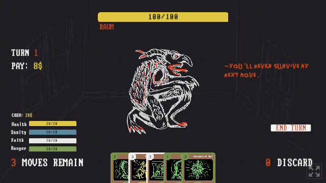 Incredible game for the genre. While I'm not the best at deck builders, I was able to pick up how all the systems work quickly via the colours. (The only issue I had is if one resource depleted, I forgot which colour it was because 0/0 made the bar red). Art is on point, and I always enjoy a game of wordle before I face my demons. Splendid job!